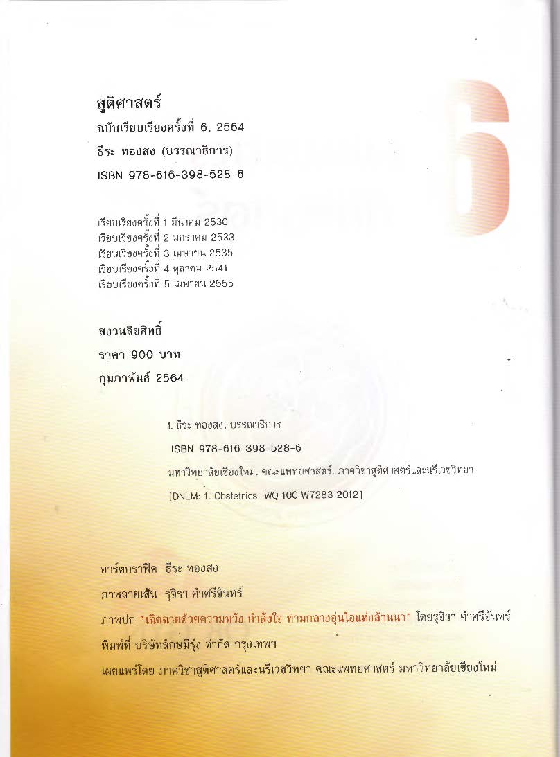 ธีระ ทองสง, บรรณาธิการ และมหาวิทยาลัยเชียงใหม่. คณะแพทยศาสตร์. ภาควิชาสูติศาสตร์และนรีเวชวิทยา. หน่วยเวชศาสตร์มารดาและทารก. 2564. สูติศาสตร์ (เรียบเรียงครั้งที่ 6) = Obstetrics. เชียงใหม่:หน่วยเวชศาสตร์มารดาและทารก ภาควิชาสูติศาสตร์และนรีเวชวิทยา คณะแพทยศาสตร์ มหาวิทยาลัยเชียงใหม่;